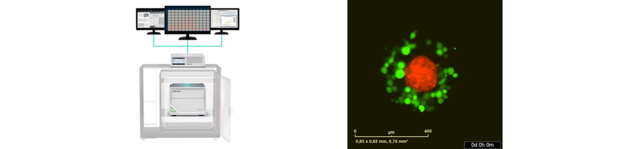 1/ Démonstration au sein d’une équipe de recherche (UNH, équipe ECREIN) de manipulations possibles sur un appareil de pointe, l’INCUCYTE®, système d’analyse en temps réel de cellules vivantes permettant de suivre la formation de sphéroïdes/organoïdes uni ou bicellulaire